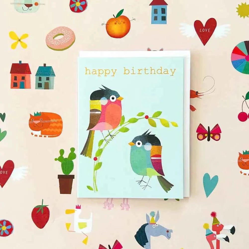 A beautiful birdie birthday card featuring birds in soft muted tones, on a soft blue background.